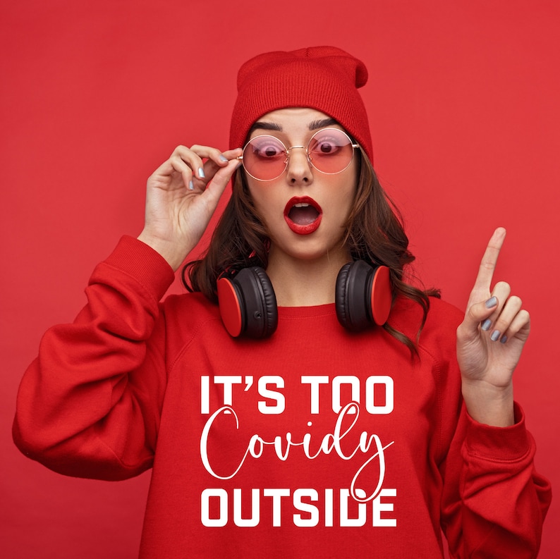 Covidy also found its way into designer clothing as illustrated below by an Etsy sweatshirt with an “It’s too Covidy Outside” design.